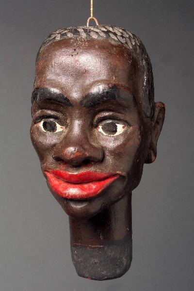 Testa con tratti somatici africani con dipintura scura. Capelli e sopracciglia e occhi scuri dipinti, bocca con labbra rosse chiuse. Gancio alla sommità del capo. Integro funzionante. Integro funzionante.