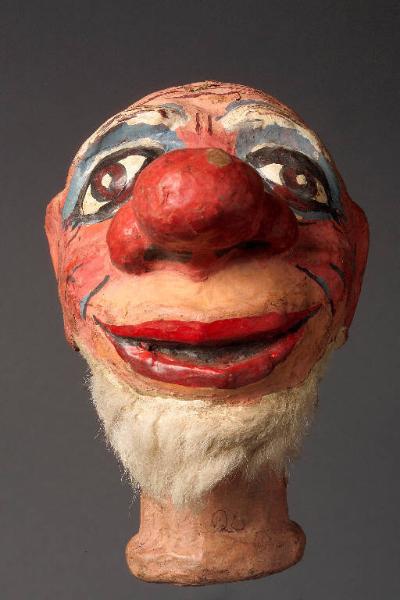 Testa modellata , incarnato rosato. Il naso a patata molto largo è di colore rosso. Occhi dipinti contornati di azzurro. Bocca con labbra rosse semiaperte con un largo sorriso. Barba posticcia di pelo animale chiaro sotto il mento che lo nasconde completamente. Integro funzionante.