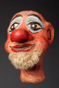 Testa modellata , incarnato rosato. Il naso a patata molto largo è di colore rosso. Occhi dipinti contornati di azzurro. Zigomi pieni. Bocca con labbra rosse semiaperte con un largo sorriso. Barba a pizzo posticcia di pelo animale chiaro sotto il mento che lo nasconde completamente e ter. Integro funzionante.