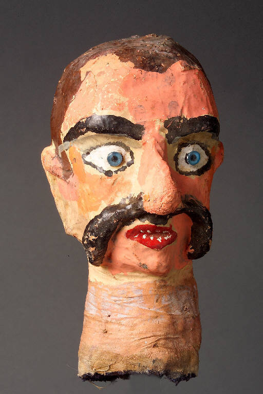 Testa di cartapesta rinforzata all'interno con canapa. Sopracciglia, baffi e capelli dipinti. Occhi di vetro applicati, baffi e capelli dipinti. Bocca con labbra rosse e denti dipinti nella parte interna. Integro funzionante.
