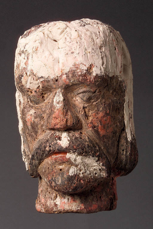 Testa scolpita e dipinta con chiazze bianche. Capelli, barba e baffi spioventi scolpiti. La dipintura originale è quasi inesistente. La bocca scolpita con labbra chiuse presenta il colore originale rosso Integro non funzionante.