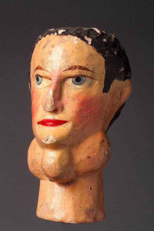 - NOTIZIE STORICO CRITICHE Teste prodotte artigianalmente in serie dalla prima metà dell'800 fino alla seconda guerra mondiale. Le varie famiglie di scultori si specializzavano nei soggetti che affluivano ad un committente che le acquistava.\nQuesti le cedeva a venditori ambulanti che riempivano le gerle di queste teste e di altri manufatti in legno prodotti nella zona (giocattoli,stoviglie,ciotole). Si ritrovano teste in collezioni di varie parti d'Europa dall'Inghilterra alla Grecia, dalla Francia ai Paesi dell'est Europa. In Italia sono presenti nelle seguenti collezioni pubbliche:Museo Teatrale alla Scala, Scuola Paolo Grassi, Museo Faraggiana di Novara, il Castello dei Burattini di Parma, Collezione Forlai del Comune di Forlì,e in numerose collezioni private, tra queste la più importante è la Collezione Mercuriali di Cesenatico. Queste teste, per la maggioranza di piccole dimensioni servivano poi per essere "vestite" e diventare burattini oppure con l'aggiunta successiva di un corpo (non prodotto in Val Gardena), diventare marionette. Le teste prodotte in dimensioni maggiori erano utilizzate da burattinai e marionettisti professionisti. Le teste dopo essere state pennellate di bianco, venivano dipinte a tempera e assumevano l'aspetto semilucido con l'aggiunta, successiva, di chiaro d'uovo. I soggetti relativi alle teste erano anche differenziati per aree culturali (Fagiolino,Sandrone,Gioppino: per l'Italia settentrionale; Guignol e Gnafron\nper la francia; Punk e Judy per l'Inghilterra, Kasperl per la Germania e i Paesi dell'Est Europeo), mentre le maschere della Commedia Dell'Arte ( Arlecchino, Brighella, Dottore, Capitano, Pantalone, ecc.), erano distribuite in tutta Europa.