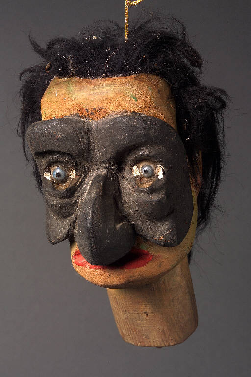 Testa scolpita adattata a marionetta. Capelli posticci in fibra naturale. Maschera con rughe profonde intagliate, dipinta di nero con naso aquilino molto evidente , occhi di vetro azzurri. La bocca è scolpita con labbra chiuse di colore rosso. Integro funzionante.