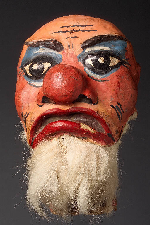 Testa modellata, incarnato rosato. Il naso a patata molto largo è di colore rosso. Occhi dipinti contornati di azzurro. Bocca con labbra rosse semiaperte sorridenti. Barba posticcia di pelo animale chiaro sotto il mento. Integro funzionante.