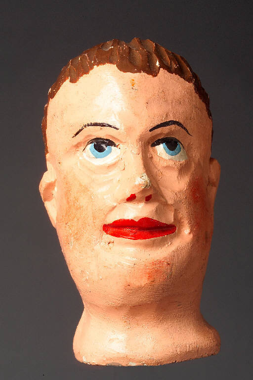 Figura maschile, testa tornita con incarnato chiaro, lo stucco di base è colorato di arancione, capelli scolpiti marroni. Utilizzabile per burattini e marionette giocattolo, occhi dipinti di azzurro.