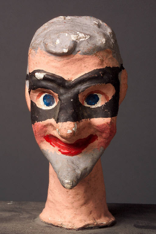 Testa modellata, incarnato chiaro, con capelli e barba a pizzo dipinti di grigio. La maschera nera lascia intravedere gli occhi dipinti azzurri. Bocca con labbra chiuse di colore rosso.