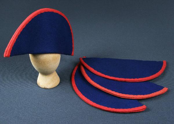 Quattro feluche di cartone con fodera di cotone bianco e rivestite di panno di lana blu, la rifinitura sul bordo è di traversino rosso.