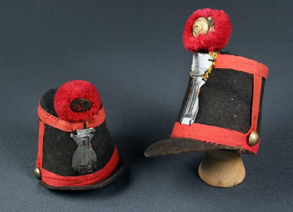 I due berretti sono di cartone rivestiti interamente di tessuto di lana nero con calotta di tessuto di cotone nero e visiera di pannolenci dello stesso colore. Presentano il bordo inferiore di traversino rosso, un fregio metallico sul davanti. Il primo presenta un pon pon di lana rossa con bottone dorato sbalzato fissato al cappello con filo di ferro e rinforzo interno di cuoio; l'altro, invece, un pon pon di lana rossa con al centro un bottone rivestito di stoffa nera.