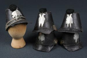 Cinque cappelli borbonici sono di cartone foderati con tessuto nero e rivestiti con tessuto nero lucido; visiera in finta pelle nera. Presentano una decorazione con doppia riga di passamaneria argento sottile alla base, fregio metallico sul davanti e pon pon di lana nera.