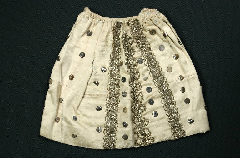 La gonna è di seta avorio con fodera di tessuto azzurro. E' decorata con tre fasce di passamaneria argento, due delle quali hanno disegno uguale, e paillettes argentate.