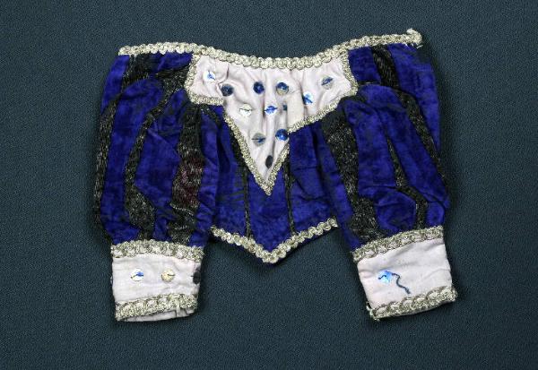 Il corpetto è realizzato in velluto blu con righe verticali nere e fodera di tela chiara. Sul davanti, che termina a punta, è applicato un inserto di seta rosa bordato con passamaneria argento e decorato con paillettes blu. Un uguale decorazione è presente sui polsi e sui bordi.