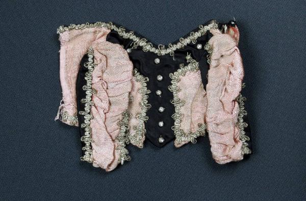 Il corpetto è realizzato in raso nero e seta rosa con fodera di cotone bianco. L'inserto di seta rosa è bordato di passamaneria argento e sul davanti sono cuciti piccoli strass. Il corpetto termina a punta e la scollatura è bordata con passamaneria argento.