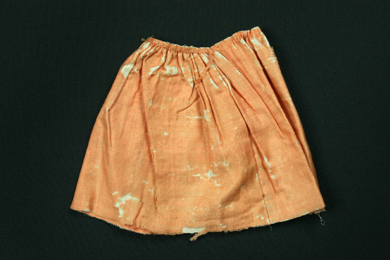 La gonna è realizzata in seta rosa salmone con fodera di cotone bianco. In vita presenta una arricciatura a coulisse con un nastrino della stessa stoffa.