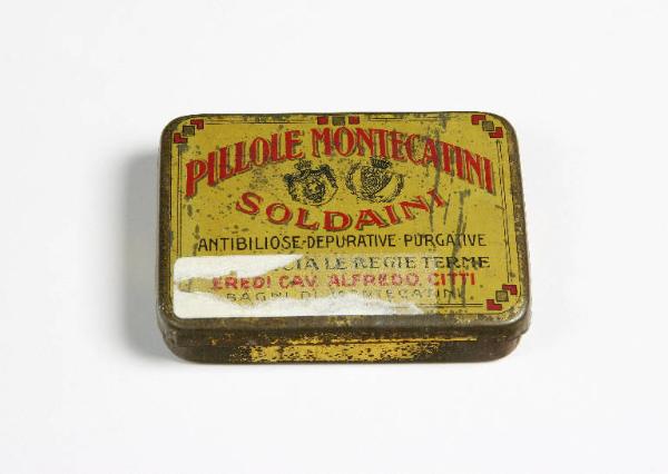 Scatola di metallo di colore giallo, rettangolare, con scritte rosse sul coperchio ed altre nere. Tra le scritte sono presenti anche due stemmi in nero. La scatola contiene piccole perline e conchigliette di madreperla con piccolo foro, alcune infilate insieme, altre sfuse.