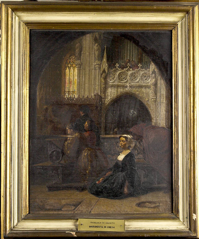 - NOTIZIE STORICO CRITICHE Il dipinto, rappresentante una scena del noto "Faust" di Goethe, si colloca nel filone di un romanticismo un pò ritardatario che caratterizza l'opera di De Criscito. La tela, presentata all'Esposizione di Brera con il titolo "Scena del Faust", è dominata dalla figura di Margherita al centro della scena sul cui volto si concentra il nucleo di più intensa luminosità, in contrasto con lo sfondo scuro della chiesa animato dalla presenza del diavolo. La tela venne acquistata nello stesso anno dall'Accademia per la cifra di seicento lire.