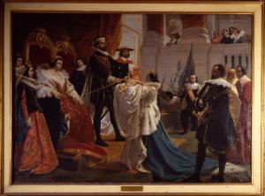 Enrico IV pone la propria spada nelle mani del neonato suo figlio. Enrico IV