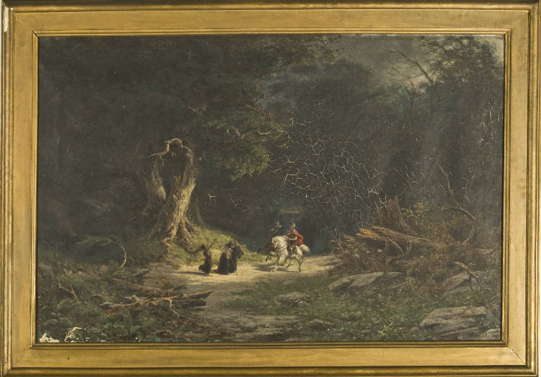 - NOTIZIE STORICO CRITICHE Il pittore partecipò, come unico concorrente, al concorso Mylius indetto nel 1875 avente come soggetto la rappresentazione della scena terza dell'atto primo della tragedia shakesperiana "Mac Beth". La commissione esaminatrice valutò meritevole del premio il dipinto del Poma per la composizione e la resa dell'arrivo dell'uragano nel bosco. La tela venne presentata all'Esposizione braidense dell'anno successivo accanto ad altri due paesaggi, "La punta di Mandello" e "La riva di Liscione", che però la critica non prese in esame per soffermarsi, invece, sul quadro premiato: il Romussi, ad esempio, ne evidenziò soprattutto le affinità con la pittura di Massimo d'Azeglio. Infatti, di quest'ultimo, il dipinto del Poma pare riprendere l'impostazione del celebrato "Muzio Attendolo Sforza getta la scure" (1843) per il rapporto proporzionale tra i personaggi e la natura e di "Una vendetta" (1834) per la ripresa del motivo dei due tronchi d'albero biforcati e l'intonazione del cielo.