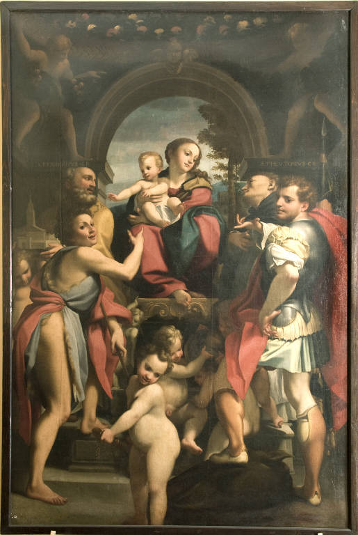 - NOTIZIE STORICO CRITICHE La pala è una copia della "Madonna di San Giorgio del Correggio" avente misure appena maggiori dell'originale. L'iconografia della pala rimane pressochè invariata: solo i santi San Geminiano e San Pietro Martire vengono sostituiti con San Frediano e San Teutonio, come indicano i nomi incisi sul cornicione alle loro spalle. Di incerta attribuzione, sin dal 1809 negli elenchi dell'Accademia la tela è registrata come opera del Rondani e, nel 1817, il Pungileone descrivendo l'opera braidense "piena della maggiore vivacità" concorda sul nome dell'autore. Una guida di Ravenna del 1783, ritenuta opera di Francesco Beltrami, ricorda al pala soltanto come replica del Correggio, mentre il Vasari, invece, dà notizia dell'ammirazione di Girolamo da Carpi per l'Allegri, tantoché gli attribuisce una replica della Madonna suddetta.
