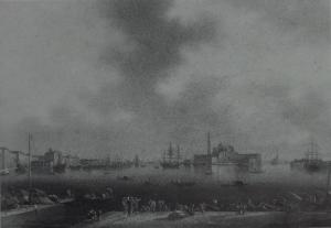 - NOTIZIE STORICO CRITICHE Il dipinto potrebbe rientrare nella serie di vedute commissionate al pittore dal Vicerè Eugenio de Beauharnais a partire dal 1809, e di cui sono noti finora i due quadri raffiguranti il "Porto di Ancona" e il "Porto di Malamocco". L'impostazione della veduta, pur rimandando agli esempi di Vernet e del Canaletto, rimanda ad un certo vedutismo di documentazione geografica e celebrativa, alla maniera dei Baseggio.