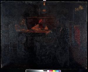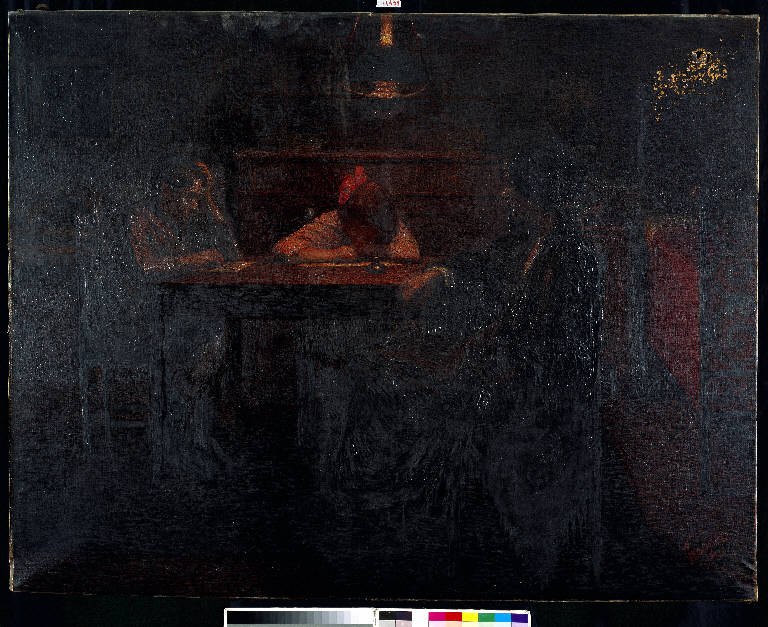 - NOTIZIE STORICO CRITICHE Il dipinto vinse il premio Canonica a Brera nel 1920. Il soggetto, rappresentante un interno domestico, una cucina, è animato dalla figura della madre coi due figli. Come nell'emblematico esempio "I mangiatori di patate" di Van Gogh, e seguendo l'esempio di movimenti artistici mitteleuropei proponenti un'esaltazione veristica della più dimessa cronaca quotidiana, il Fornari recupera il tema della denuncia sociale, ponendo l'attenzione sulla resa realistica della scena. La fioca luce, concentrata al centro della stanza, rende ancor più forte la drammaticità della scena; allo stesso tempo, la dimensione del dipinto conferisce una sorta di monumentalità alla scena.