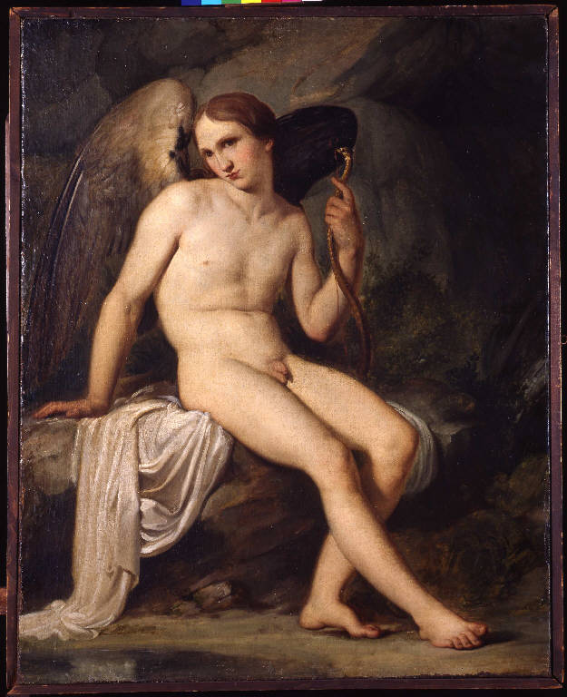 - NOTIZIE STORICO CRITICHE Non figurando nelle liste degli ogetti d'arte appartenuti alla madre Teresa Manzoni Borri, il dipinto venne venduto o più probabilmente donato da Hayez all'amico conte Stampa. Il dipinto può essere riconducibile agli anni romani (tra il 1813 e il 1818) quando l'artista frequentava Antonio Canova e Pelagio Pelagi, dalle cui opere traette spunto per la composizione di questo Cupido. Infatti, se la posa incrociata delle gambe e il corpo adolescente rimandano al genio funebre canoviano nella "Tomba a Clemente XIII" in San Pietro, la ricchezza della materia pittorica rinviano, invece, all'inscenatura decorativa del Palagi negli affreschi di Torlonia a cui aveva colaborato anche il maestro veneto. Infine, la morbidezza del modellato plastico, ricordano i modi di Guido Reni, ravvisabili in particolare nel "San Giovanni Battista nel deserto" (Duldwich College di Londra) o nel "San Sebastiano" (Pinacoteca Nazionale di Bologna).