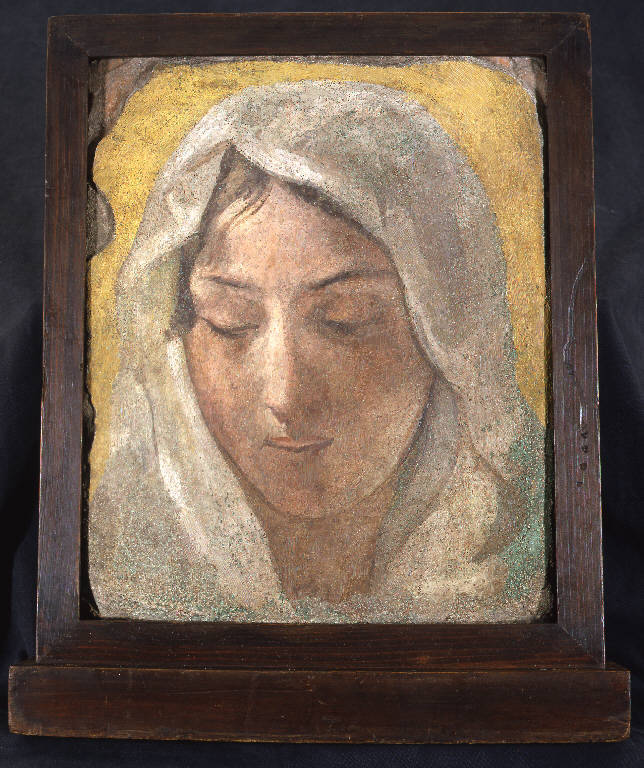 - NOTIZIE STORICO CRITICHE L'affrsco è documentato unicamente nel catalogo dell'esposizione retrospettiva delle opere dell'artista, tenutasi a Brera nel 1883, come "Studio di testa dipinta a fresco su mattone; ripetuta poi nel quadro della "Sete". Giammai esposta - eseg. circa 1835 Prop. - Nob. signora Giuseppina Cavezzali". Dovrebbe perciò trattarsi dello studio per la figura velata all'estrema destra in alto del grande dipinto dedicato a "La sete patita dai primi crociati a Gerusalemme", eseguito per il Palazzo Reale di Torino tra il 1833 e il 1850.