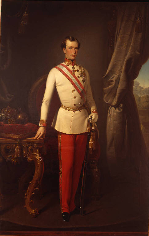 - NOTIZIE STORICO CRITICHE Il dipinto è entrato in Accademia, come anonimo e senza alcuna indicazione sul soggetto, in circostanza ancora sconosciute. In occasione della mostra "Il Veneto e l'Austria" (1989), Ferdinando Mazzocca ha riconosciuto il dipinto come una replica del disperso ritratto di Francesco Giuseppe I d'Austria che il pittore consegnò al regnante nel 1852. Il confronto con l'originale, è reso possibile grazie all'incisione a bulino su rame ricavata dall'originale da Carlo Raimondi conservata presso l'Accademia di Brera. Benchè non sia possibile ascrivere totalmente l'opera ad Hayez per la durezza che la caratterizza, senz'altro il dipinto è uscito dall'atelier del maestro il cui tocco si può riconoscere nella mano guantata che regge la spada o nel volto del ritrattato. La tela, probabilmente destinato ad un'importante sede pubblica, si differenzia dal primo innanzitutto per lo sfondo in cui viene sostituita la veduta di Villa Reale con la chiesa viennese di Santo Stefano. Le altre varianti, che denotano una maggiore semplicità della tela, sono: la mancanza dello stemma asburgico in alto, la riduzione delle dimensioni del tavolino, e la scomparsa del tappeto. Per quanto riguarda il ritratto, quì viene rispettata la ritrattistica aulica, riscattata solo dalla resa dell'ambiente e dei costumi. Il dipinto, deve aver colpito il pittore Franz Xavier Winterhalter che, nel 1865, ne ripropone le forme e i modi per il ritratto della coppia imperiale (Vienna, Kunsthistoriches Museum, Gemaldegalerie).