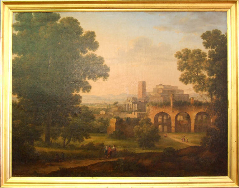 - NOTIZIE STORICO CRITICHE Del dipinto non si hanno notizie certe. Probabilmente venne realizzato nel 1810 come saggio del secondo anno di pensionato romano e probabilmente identificabile con il "Paesaggio" presentato l'anno succesivo alla rassegna braidense. Della tela esiste una replica di dimensioni ridotte (50 x 62 cm) venduta a Parigi il 17 marzo 1987, inserito nel catalogo della casa d'asta Ader Picard Tayan.