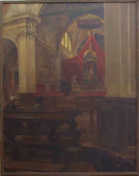 - NOTIZIE STORICO CRITICHE La tela, di cui non si conosce la provenienza, è citata negli inventari dal 1943. Il dipinto rappresenta uno scorcio della chiesa di San Marco: l'abisde, il presbiterio e parte del transetto sinistro. La modesta rappresentazione degli interni, realizzata con un tratto pittorico asai sbrigativo, permette però di riconoscere alcune delle opere che decorano la chiesa: l'altare maggiore dell'Albertolli, gli affreschi del Genovesino sulla volta del presbiterio, la tela del Battesimo di Sant'Agostino del Cerano, gli affrschi di Procaccini il giovane e, infine, la copia della Deposizione di Caravaggio.