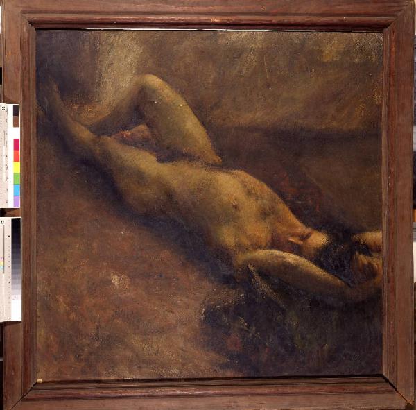 - NOTIZIE STORICO CRITICHE L'artista, già vincitore del premio Hayez per il biennio 1922-1924, nel 1924 vinceva anche il premio indetto dalla Fondazione Canonica a cui parteciparono oltre allo stesso artista anche Luigi Bracchi, Gianfranco Campestrini, Angelo Del Bon e Renato Fasoli. Come per lo "Studio di nudo", anche per questa tela il Mossa decide di impostare il suo lavoro sull'evidenza anatomica del modello. Il taglio quadrato, la disposizione obliqua, quasi dall'alto, del personaggio rimandano ai modelli cinquecenteschi - specialmente a Tiziano e alla sua scuola - e ai nudi michelangioleschi riletti in chiave scapigliata.
