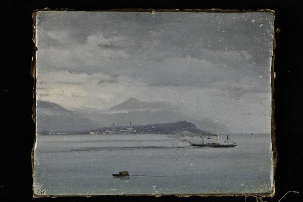 - NOTIZIE STORICO CRITICHE Entrato in Accademia per mezzo del Legato Stampa (1900) , la tela va pensata in rapporto con "Le isole Boromee" costituendo la naturale prosecuzione della vista verso sud. Come nella veduta citata, anche in questo caso, il Prinetti riprende la tecnica già utlizzata nella piccola veduta per cui il battello in primo piano è raffigurato nitidissimo, mentre la riva sullo sfondo appare, invece, sfocata e più distante rispetto alla distanza reale.