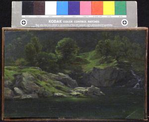 - NOTIZIE STORICO CRITICHE Il piccolo quadro, pervenuto come molti altri attraverso il legato Stampa (1900) , potrebbe essere lo studio preparatorio per un dipinto apparso all'Esposizione del 1852 - la "Veduta del fiume Anza a Calasca" - che veniva citato anche sulle pagine del "Cicerone": Fra i molti bei paesaggi di Costantino Prinetti va per verità, gusto e buon impasto distinto il paesaggio più grande in cui espresse un torrente". Tra l'altro, il programma di quell'anno per il Concorso di I classe per la pittura di Paesaggio, prevedeva proprio la rappresentazione di un torrente e del paesaggio circostante (Atti, p. 51). La conduzione del paesaggio con pennellate larghe, piatte, brevi e piuttosto pastose, si allinea alla ricerca pittorica della pittura svizzera ed ai modi dei pittori Lange e Calame, tanto da confermare il possibile viaggio dell'artista nei paesi del nord Europa di cui resta testimonianza nella veduta "Reminiscenze di una vallata in Isvizzera" presentata alla mostra braidense nel 1850.