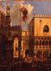 - NOTIZIE STORICO CRITICHE La tela, giunta in Accademia con il legato Ala Ponzoni (1889), è identificabile con quella esposta dal Querena all'Esposizione di Brera del 1859, ovvero "La Porta della Carta, nel momento in cui si festeggia la sconfitta del patriarca di Aquileja e de'suoi dodici canonici, raffigurati nel toro e nei dodici majali, cacciati dal popolo (...)". Il Querena, che esordì a Brera nel 1850 con vedute di Venezia o con illustrazioni di episodi ispirati alla storia della Repubblica, in questa tela dal forte impianto prospettico rievoca la vittoria dei Veneziani sul Patriarca di Aquileia nel 1162, aderendo pienamente alle "vedute istoriate" che ebbe come maggiore interprete il pittore Giovanni Migliara.