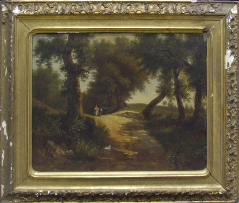 - NOTIZIE STORICO CRITICHE Il dipinto non figura tra quelli che il d'Azeglio portò alle Esposizioni braidensi nella sua carriera. La tela raffigura un paesaggio dell'Ariccia, una località in cui il pittore sostò durante l'esilio del 1826 e, come era solito fare, ripropose in questa tela postuma databile negli anni Quaranta del XIX secolo. Al paesaggio romano, realizzato in modo convenzionale, quasi banale, si possono accostare tre varianti: il dipinto realizzato nel 1832, "Veduta della via della Riccia" citato in una lettera all'amico Cesare della Chiesa Benevello, la "Strada nella foresta con cavaliere e pedone" conservato alla Galleria Civica d'Arte Moderna e Contemporanea di Torino e il "Bosco con radura soleggiata", sempre a Torino.