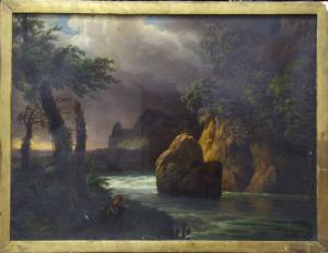 - NOTIZIE STORICO CRITICHE Il dipinto appare molto prossimo alla celebre "Inondazione in una valle delle Alpi" del 1837: identico il torrente che scorre impetuoso mentre due figurine cercano di allontanarsi dal fiume dirigendosi verso il bosco. Il soggetto viene indagato più volte dall'artista, come dimostrano i disegni del taccuino datato 1839 a cui si può far risalire anche la tela in questione. L'iconografia del dipinto ricorda "Il naufrago" del francese Claude-Joseph Vernet, nell'attenzione del dato atmosferico e nel particolare degli alberi piegati dal vento. La fortunata serie di paesaggi, ricchi di elementi emotivi e sentimentali, porteranno il d'Azeglio ad essere celebrato dalla critica piemontese ancora nel 1861, in occasione della sua partecipazione alla Promotrice di Belle Arti, per la perfetta commistione tra paesaggio d'invenzione e natura ideale.