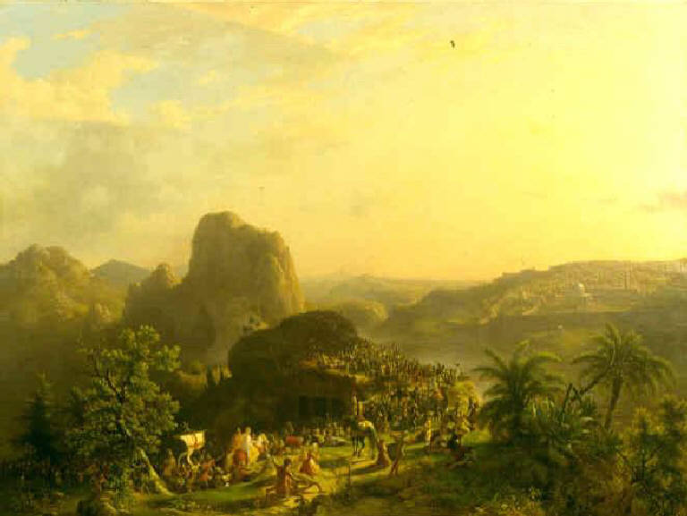 - NOTIZIE STORICO CRITICHE Il tema de "I Lombardi alla prima Crociata" tratto dal poema del Grossi, era già stato presentato a Brera dal Bisi nel 1837, quando Giacomo Treves gli commissionava, per l'appunto, un "Paesaggio storico con macchiette preso dal primo canto dei Lombardi alla prima Crociata del Grossi". In quell'occasione, il recensore dell'"Album" Giuseppe Sacchi, definisce il dipinto "paesaggio storico", presentandolo sulle pagine del libro con il titolo "I Lombardi alla prima Crociata" (canto I, stanza 36). Il successo del dipinto fu tale che anche il conte Filippo Ala Ponzoni gli commissiona, nel 1839, una seconda opera ispirata ad un altro canto del poema del Grossi. Come nella prima versione, anche in questo caso la tela è realizzata quasi fosse una scena dal vero, sconstandosi dai modi del contemporaneo D'Azeglio; entrambe le tele, inoltre, si caratterizzavano per la fedeltà al testo. Il poema del Grossi godette di molta fortuna, tanto da venir raffigurato in molteplici varianti: di Hayez ricordiamo le tre stampe litografiche riferite al poema (1827-1828) e l'immensa tela "La sete patita dai primi Crociati sotto Gerusalemme" realizzata per il Palazzo Reale di Torino (1833-1850); del 1844, è "La partenza d'un Crociato" di Mauro Conconi; segue, nel 1852, "La sete dei Crociati" di Giulio Carlini; infine, del 1861, è "I Lombardi alla prima Crociata in Palestina alla scoperta della foresta Saron" di Gustavo Adolfo Ponti.