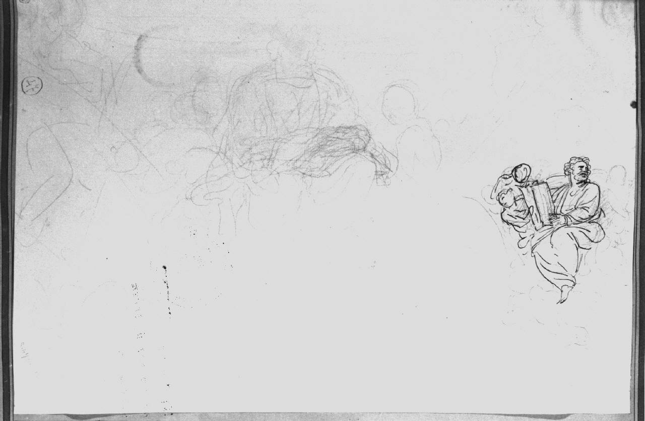 - NOTIZIE STORICO CRITICHE Il disegno presenta due studi per San Matteo e uno studio per San Giovanni, due dei quattro Evangelisti raffigurati nei pennacchi della cupola della chiesa di Santa Maria presso San Celso, affrescata da Appiani tra il 1792 e il 1795.\nAl verso due studi di teste maschili.\nIl disegno faceva parte della collezione privata di G. Vallardi che, intorno al 1820, ordinò in album ben 344 disegni di Appiani. L'album, di formato atlantico, pervenne all'Accademia di Brera nel 1875 per donazione di E. Cernuschi, allora residente a Parigi dove lo acquistò nel 1856-1860 (periodo in cui a Parigi si tennero aste di vendita di opere di provenienza Vallardi).