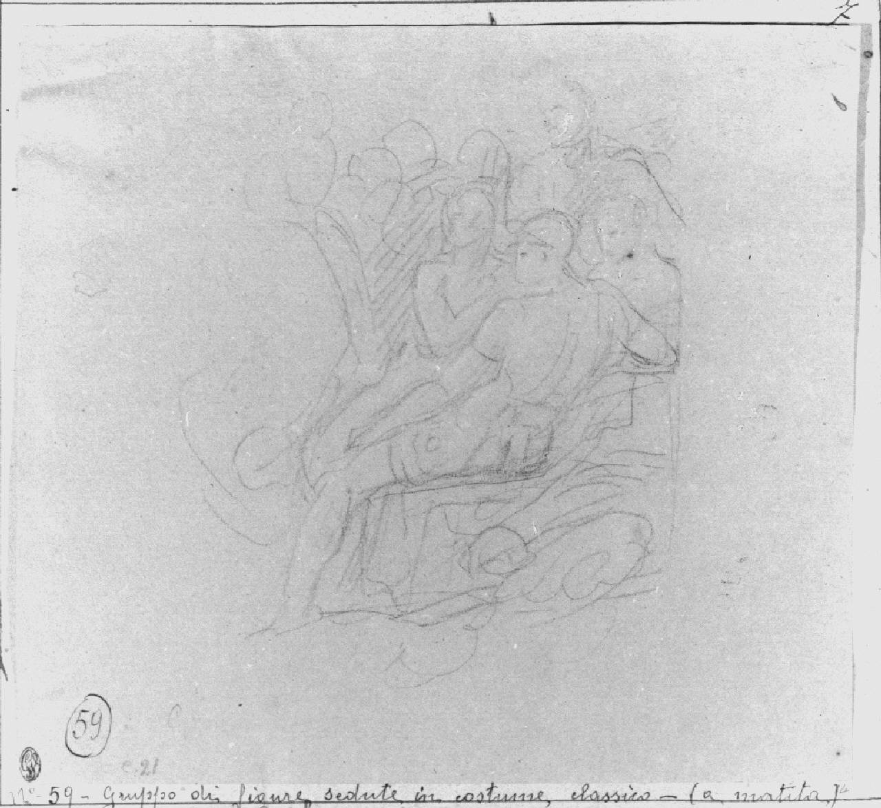 - NOTIZIE STORICO CRITICHE Il disegno presenta lo studio di un gruppo di figure, probabilmente divinit, che faceva parte di una composizione più vasta a carattere mitologico-allegorico. Il disegno faceva parte della collezione privata di Giuseppe Vallardi che, intorno al 1820 ordinò in album ben 344 disegni di Appiani. L'album, di formato atlantico, pervenne all'Accademia di Brera nel 1875 per donazione di E. Cernuschi, allora residenta a Parigi, dove lo acquistò nel 1856-1860 (periodo in cui a Parigi si tennero aste di vendita di opere di provenienza Vallardi).