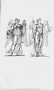 - NOTIZIE STORICO CRITICHE Il disegno presenta lo studio di due Vittorie alate e fa parte di una serie di studi eseguiti da Appiani in commemorazione delle vittorie dell'armata napoleonica. Il tema si inserisce perciò nell'ambito della produzione appianesca di committenza napoleonica e lo stile, particolarmente veloce nell'andamento lineare, è proprio degli anni intorno al 1805-1810 ca. Il disegno faceva parte della collezione privata di Giuseppe Vallardi che, intorno al 1820 ordinò in album ben 344 disegni di Appiani. L'album, di formato atlantico, pervenne all'Accademia di Brera nel 1875 per donazione di E. Cernuschi, allora residenta a Parigi, dove lo acquistò nel 1856-1860 (periodo in cui a Parigi si tennero aste di vendita di opere di provenienza Vallardi).