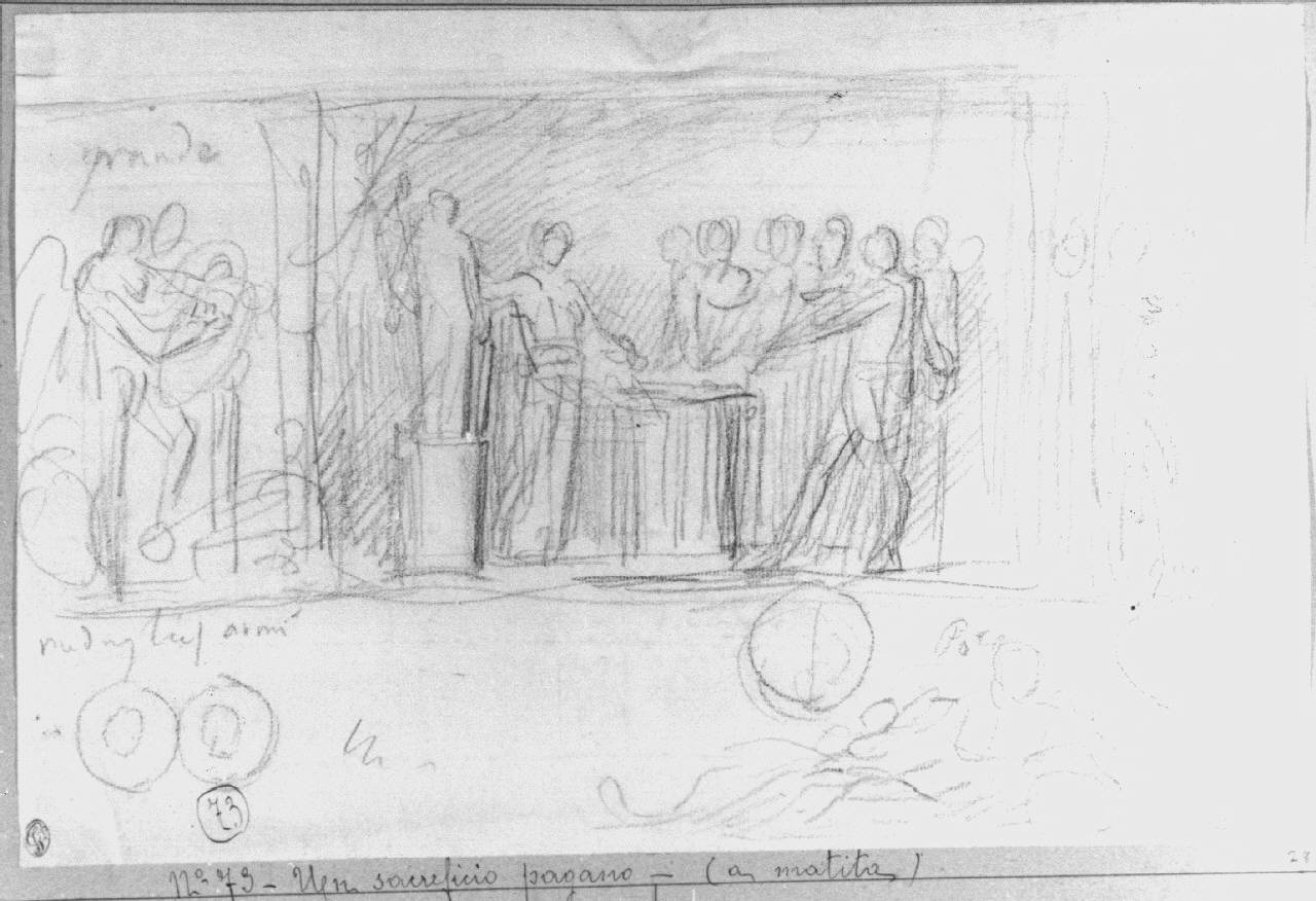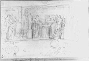 - NOTIZIE STORICO CRITICHE Il disegno presenta uno studio incentrato sul tema del Giuramento, collocato al centro del foglio. Sui lati, a sinistra, la raffigurazione allegorica di un genio alato in atto di scrivere su uno scudo, a destra alcuni armati. Sotto, a sinistra, due medaglioni (trofei d'armi?), mentre a destra la personificazione del fiume Po. Lo studio è collegabile al ciclo dei "Fasti napoleonici" e, in particolare, agli episodi relativi ad armi di Giuramenti civile, anche se non è riferibile ad un preciso episodio del ciclo che comprendeva 35 tele a tempera eseguite tra il 1800-1081 e il 1807 per la Sala delle Cariatidi di Palazzo Reale, poi distrutti con i bombardamenti del 1943. Il disegno faceva parte della collezione privata di Giuseppe Vallardi che, intorno al 1820 ordinò in album ben 344 disegni di Appiani. L'album, di formato atlantico, pervenne all'Accademia di Brera nel 1875 per donazione di E. Cernuschi, allora residenta a Parigi, dove lo acquistò nel 1856-1860 (periodo in cui a Parigi si tennero aste di vendita di opere di provenienza Vallardi).