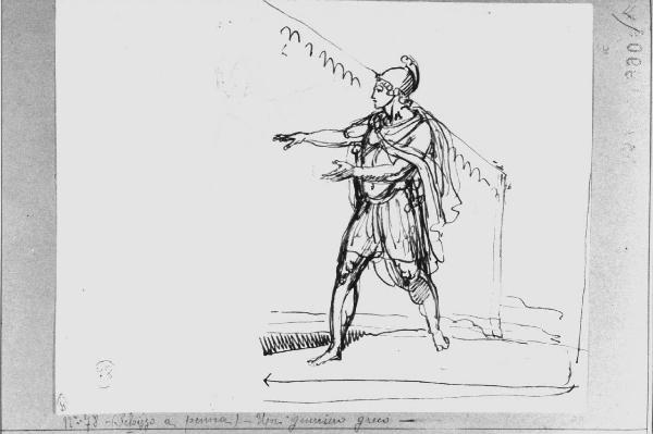 - NOTIZIE STORICO CRITICHE Il disegno è uno studio di un guerriero [Romano ?] in atto di avanzare. Il soggetto potrebbe essere posto accanto agli studi per gli affreschi [non eseguiti] per la Sala della Lanterna di Palazzo Reale, dedicati a episodi tratti dall'antica storia romana [pacificazione tra Quiriti e Sabini]. Se ciò fosse vero, il disegno andrebbe collocato intorno al 1812-1813, anche se lo stile, un po' incerto farebbe propendere per una datazione anteriore, sempre entro il primo decennio del XIX secolo.\n\nAl verso, studio di ornato per soffitto, con un velario visto in prospettiva dal basso e un dettaglio dello stesso.