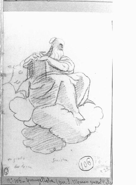 - NOTIZIE STORICO CRITICHE Il disegno è uno studio per uno degli evangelisti (probabilmente San Luca) rappresentati ad affresco nei pennacchi della Cupola della chiesa di Santa Maria presso San Celso. Il disegno mostra uno stile "anomalo", dal tratto piuttosto secco e dall'andamento alquanto rigido, inusuale rispetto agli studi per San Celso. Forse questo dipende dal fatto che il disegno è uno studio dei colori e non dell'impianto compositivo, come indicato dalle scritte.