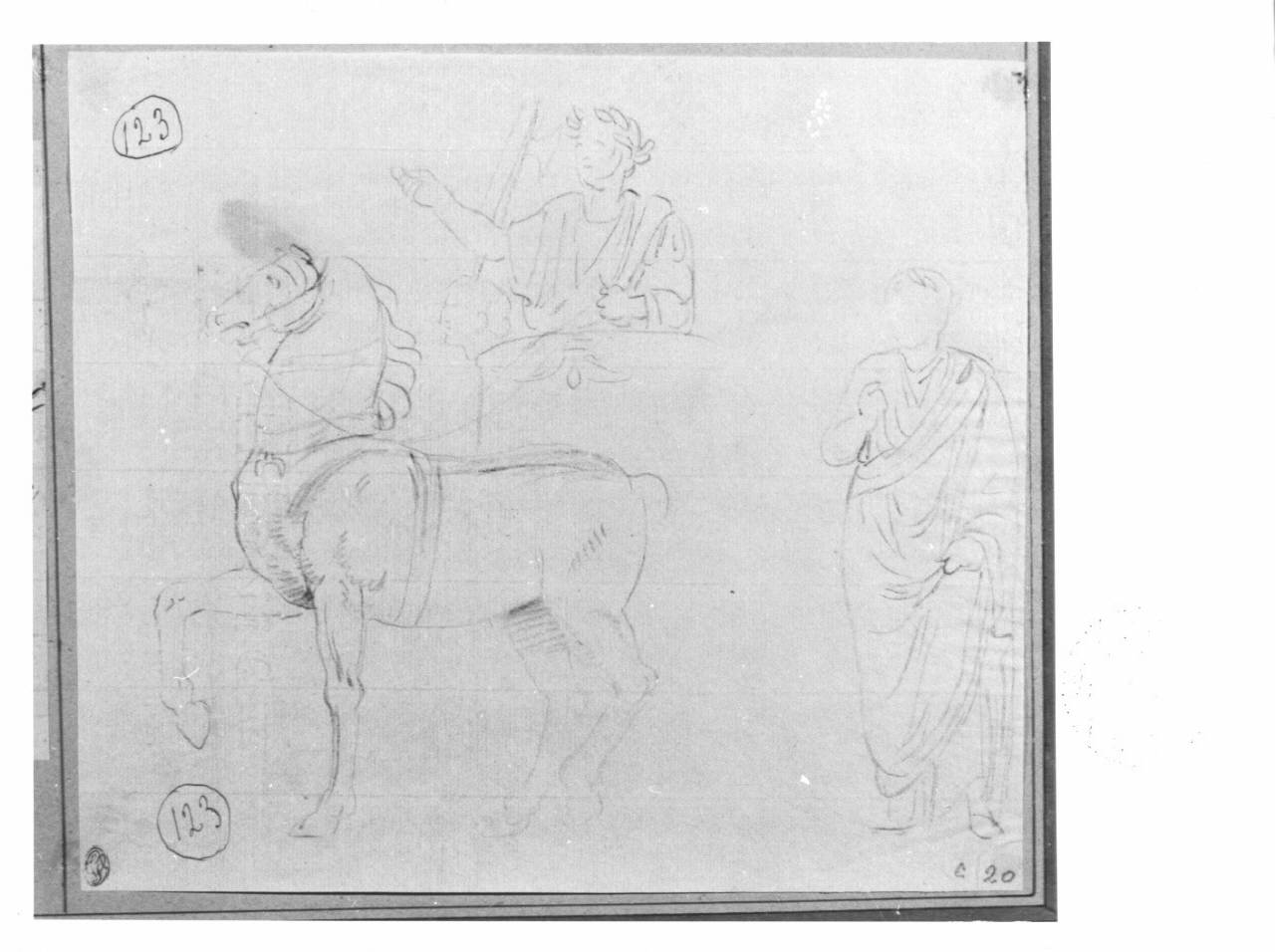 - NOTIZIE STORICO CRITICHE Il disegno presenta studi per un trionfo ispirato all'antica storia romana. Il soggetto fa ipotizzare che si tratti di uno studio vicino alla serie di disegni per un fregio, non realizzato, rappresentante un corteo trionfale. Questo disegno, per stile e per soggetto, è databile agli anni intorno al 1805-1810 circa.