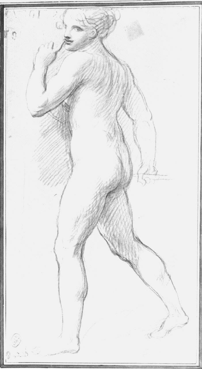 - NOTIZIE STORICO CRITICHE Il disegno è lo studio di un nudo femminile in atto di avanzare. Non è facile identificare l'opera di riferimento, ma stilisticamente è affine agli studi per affreschi di Palazzo Reale ideati da Appiani nel 1808-1810 circa, e a quelli per il "Parnaso" di Villa Reale (1811).\n\nSolo per il Parnaso.\nAl verso studio di braccio femminile per la medesima figura.