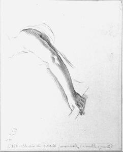 - NOTIZIE STORICO CRITICHE Il disegno è lo studio del braccio della Vittoria alata di destra in primo piano che regge il trono di Napoleone nell'affresco rappresentante "L'Apoteosi di Napoleone", eseguito da Appiani nel 1808. E' uno dei pochi affreschi rimasti a documentare l'attività del maestro per Palazzo Reale. Staccato, è conservato a Tremezzo presso Villa Carlotta.\n\nAl verso, studio della figura della Vittoria alata di sinistra in primo piano che regge il trono di Napoleone nell'affresco rappresentante "L'Apoteosi di Napoleone", eseguito da Appiani nel 1808.