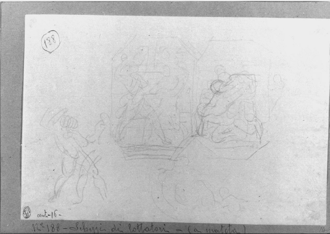- NOTIZIE STORICO CRITICHE Il disegno è uno studio per i "Pugilatori", uno dei pochi episodi previsti e poi eseguiti ad affresco nella Sala della Lanterna di Palazzo Reale (1812-1813). Di questo soggetto esistono studi e il cartone preparatorio (Bologna, Pinacoteca Nazionale). La decorazione della Sala con soggetti tratti dall'antica storia romana, non venne ultimata a causa dell'ictus che colpì Appiani nel 1813 e che lo costrinse all'inattività fino alla morte , avvenuta nel 1817.