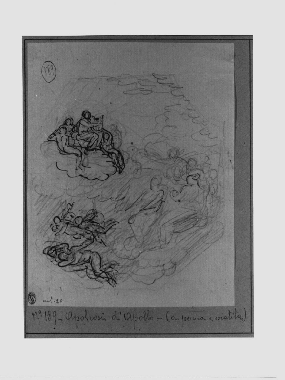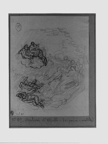 - NOTIZIE STORICO CRITICHE Molto probabilmente, il disegno è un primo studio per l'affresco, non realizzato, raffigurante "Il trionfo di Giove sui Giganti in Flegrea" di cui esiste un disegno con l'idea definitiva. Il progetto venne approvato il 23/01/1804 da una commissione formata da G. Traballesi, V. Monti e G. Bossi, e doveva decorare il medaglione centrale della Sala delle Cariatidi di Palazzo Reale. La composizione doveva essere eseguita nel 1812 per celebrare la campagna di Russia ma, dato l'esito disastroso, non fu realizzata.\n\nVerificare. Trionfo di Apollo