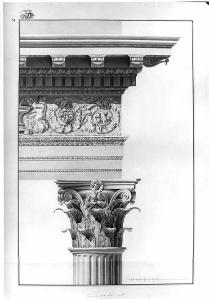 Dettaglio di trabeazione a china e bistro con ombreggiature più scure. Trabeazione e capitello della colonna nel corinzio secondo Vignola. Colonna scanalata, capitello ornato da foglie, abaco con fiore, architrave tripartito, cimazio dell'architrave, fregio con bassorilievo, cimazio con apofige del fregio, sottocornice e cornicione.