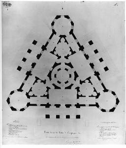 Pianta terrena di edificio con murature campite a china e finestre a bistro. Edificio a pianta triangplare, con pronai aggettanti preceduti da gradini, posti sui lati. Sugli spigoli vi son 3 corpi ettagonali sporgenti con vano circolare all'intemo. Al centro del triangplo scala circolare iscritta in un vano triangolare. Sugli spigoli vani esagonali irregolari. Lungo i lati vani rettangolari. AlI'interno dei locali numeri di rif. agli indici posti a sin. e a ds.del disegno.