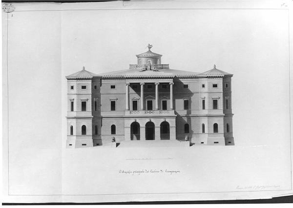 Prospetto di edificio a china e bistro con ombreggiature più scure. Edificio simmetrico a 3 p. con parte centrale in aggetto: al pt. portico a tre arcate preceduto da scalini; sup. loggiato con 4 colonne ioniche in ordine gigante sormontate da trabeazione ornata da gruppo scultoreo. Ai lati della parte in aggetto: al pt. 1 finestra ad arco, ai piani sup. 1 finestra rettangolare. Sugli spigoli della facciata corpi poligonali aggettanti con fin. ad arco al pt. e rett. ai piani sup. Tetto a padiglione. Al centro terrazza e torretta semicircolare.